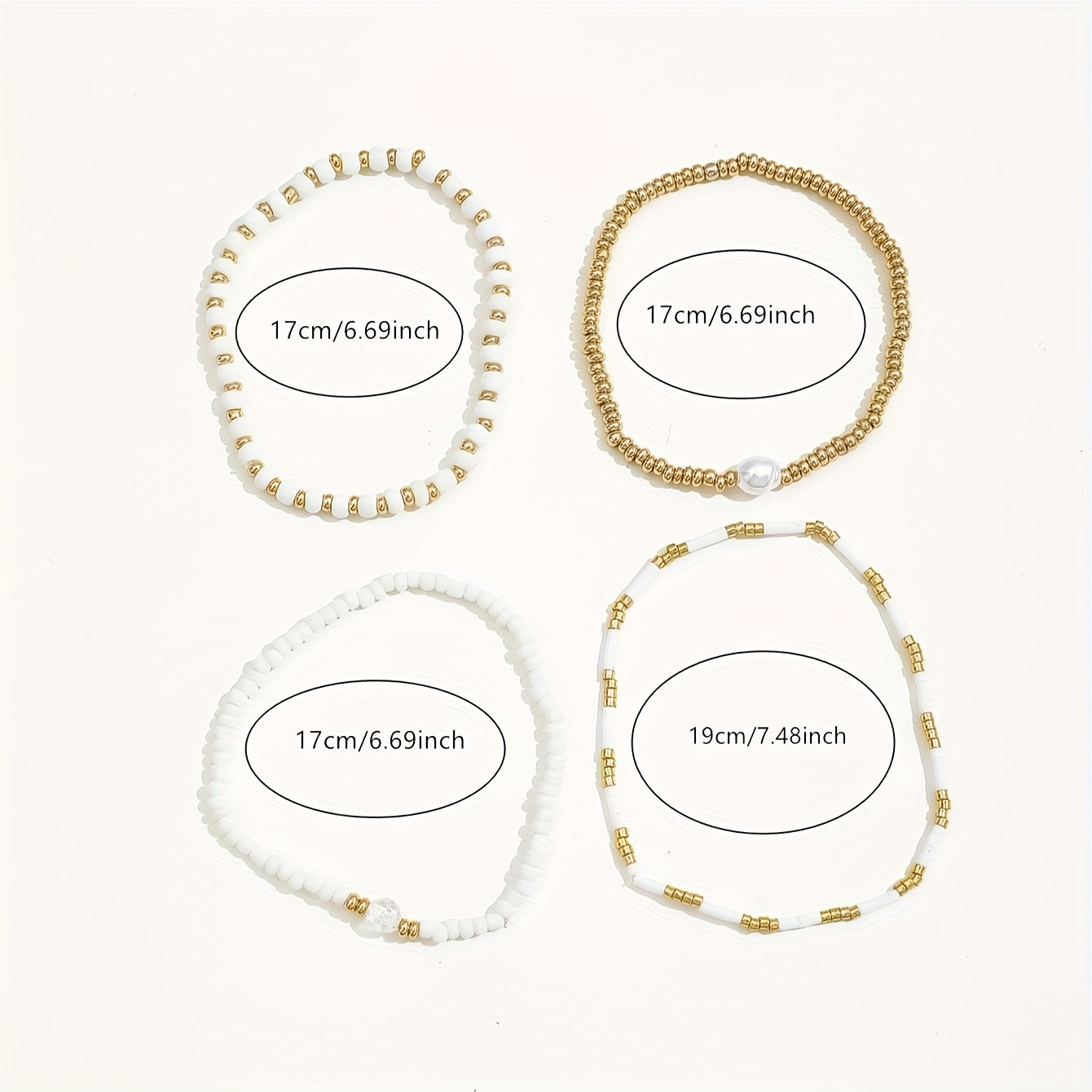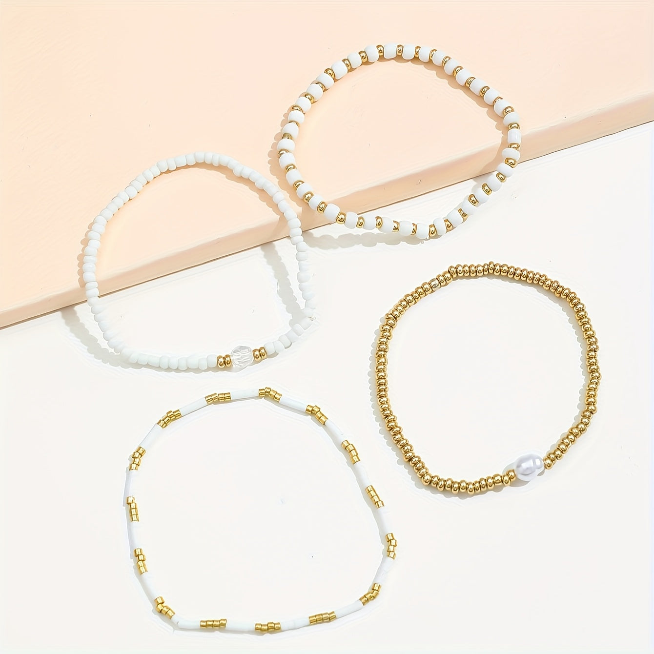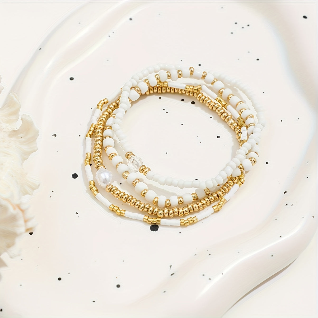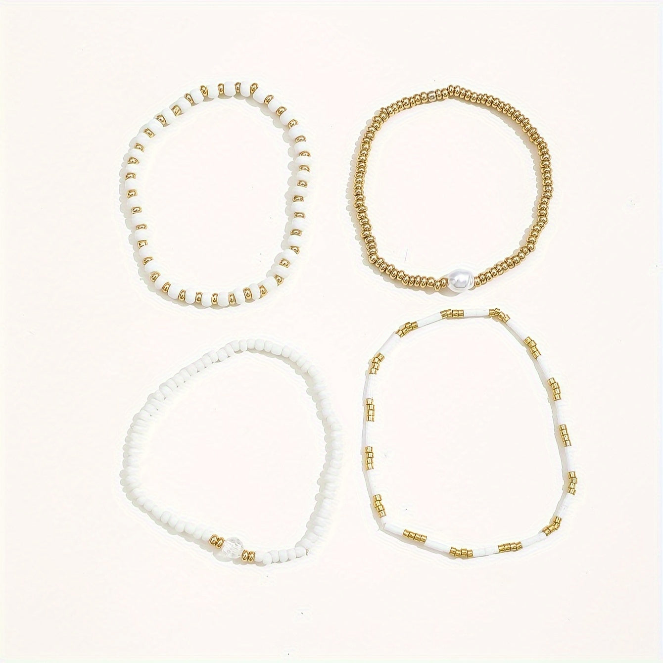 צמידים בגוון לבן בעיצוב בוהמיי נקי, עם שילוב חרוזים וטקסטורות שונות,